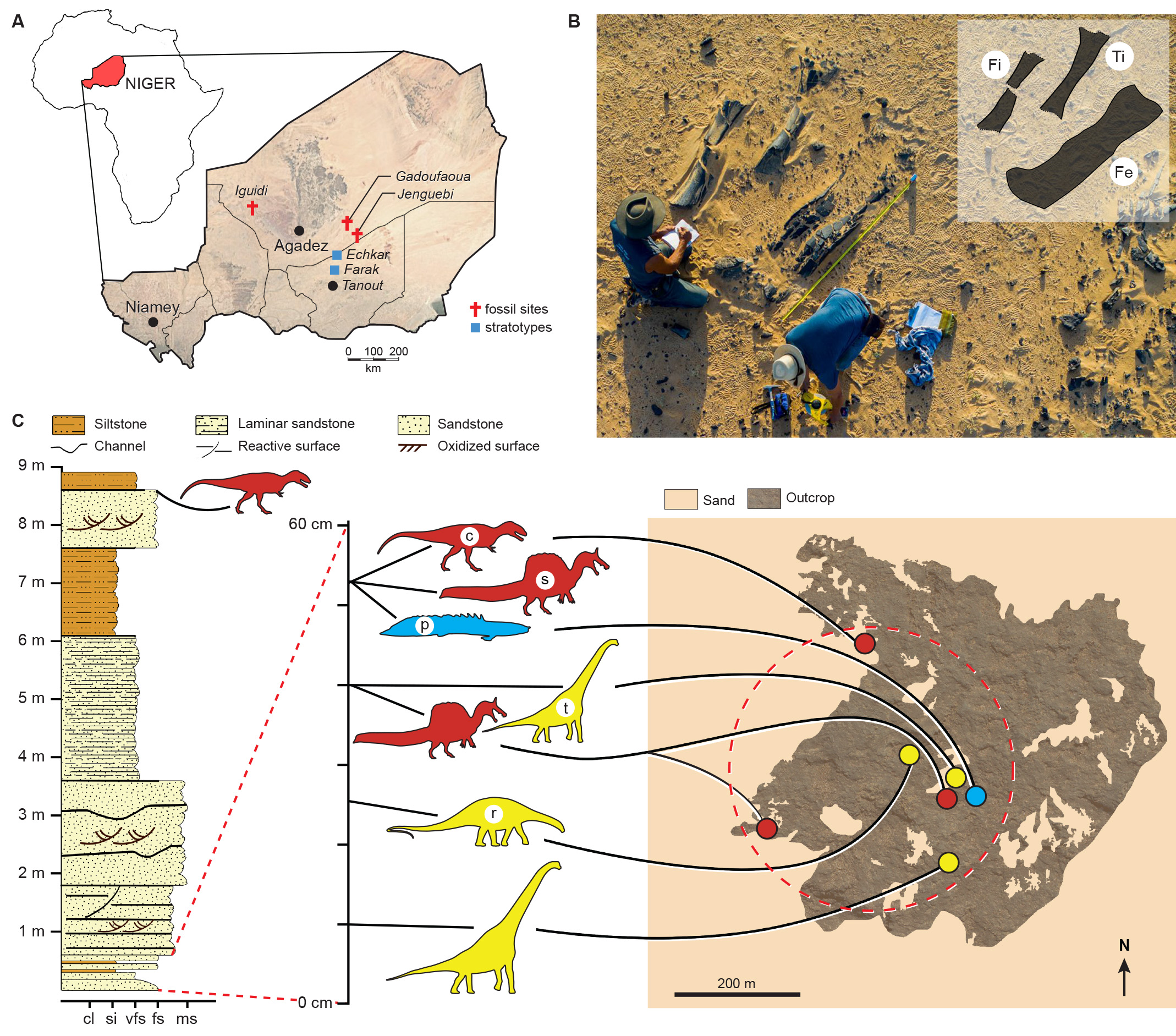 Fig. 1. Locality of S. mirabilis sp. nov. in Niger. (A) Location of the fossil areas Jenguebi, Gadoufaoua, and Iguidi (In Abangharit) and the stratotype sections of the Echkar and Farak Formations. (B) Drone photograph of the Sirig Taghat locality in the Jenguebi area showing the associated hind leg of a partial skeleton of a large unnamed titanosaurian. (C) Stratigraphic section (left) of the Farak Formation in the vicinity of the type locality for S. mirabilis with a map of key specimens from the lowermost 60 cm. Also shown in an ~8- to 9-m upsection is an associated carcharodontosaurid skeleton collected nearby. A map (right) of the central exposure at Sirig Taghat shows the proximity of the largebodied fauna (dashed circle, 450 m diameter). c, Carcharodontosaurus sp.; cl, clay; Fe, femur; Fi, fibula; fs, fine sand; ms, medium sand; p, unnamed polypterid; r, unnamed rebbachisaurid; s, S. mirabilis; si, silt; t, unnamed titanosaurian; Ti, tibia; vfs, very fine sand