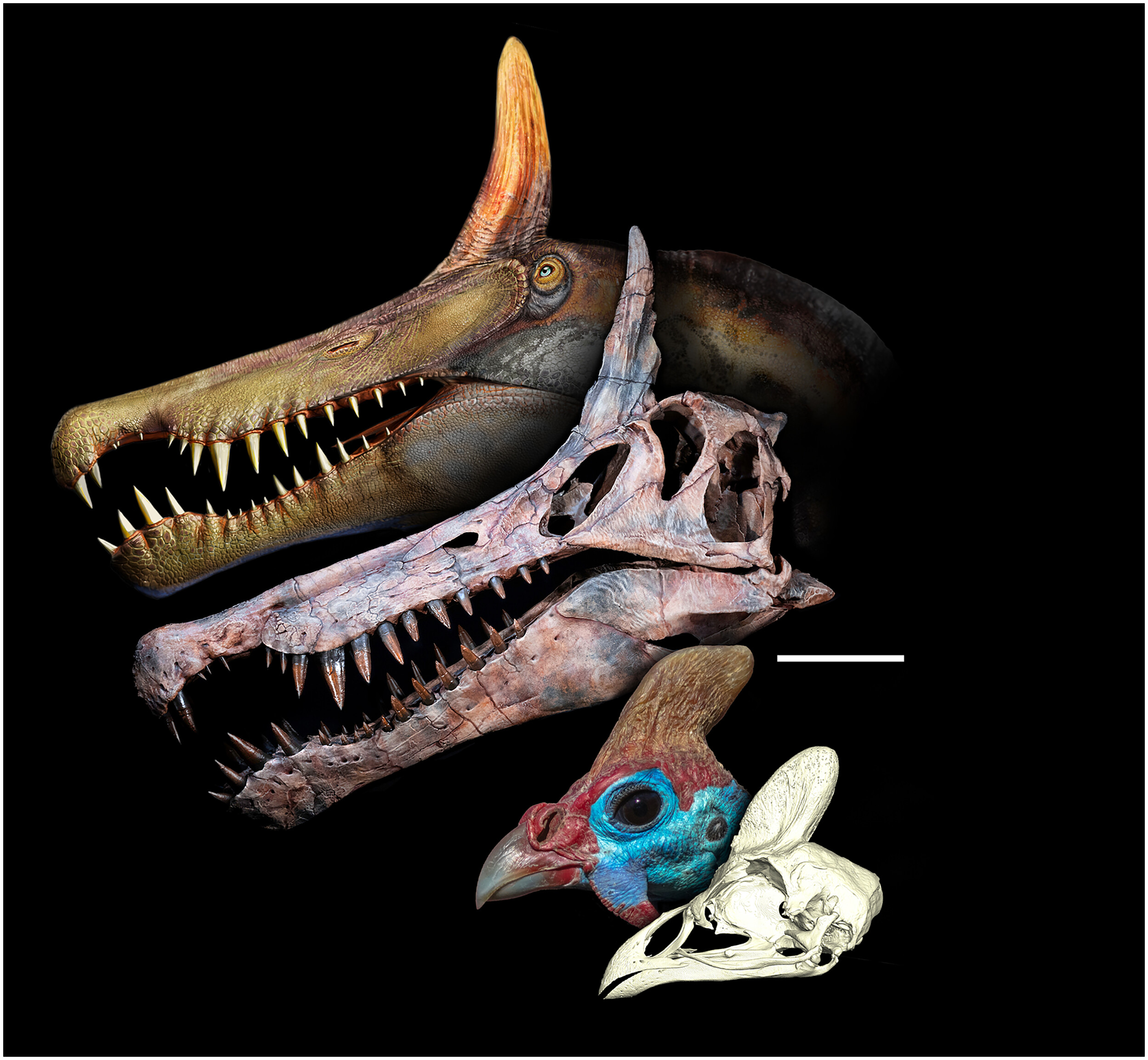 S. mirabilis sp. nov., evolved the tallest head crest of any theropod dinosaur, drawing attention to the midline ornamentation that characterizes the cranium and axial skeleton of all spinosaurids. In life, the crest would have been extended to some degree by a keratinous sheath, as in the living helmeted guinea fowl (Numida meleagris). Visual signaling, as is the case in guinea fowl and other crested avians, was likely the function of spinosaurid cranial crests and trunk and tail sails. Scale bar, 20 cm for S. mirabilis and 3 cm for N. meleagris.